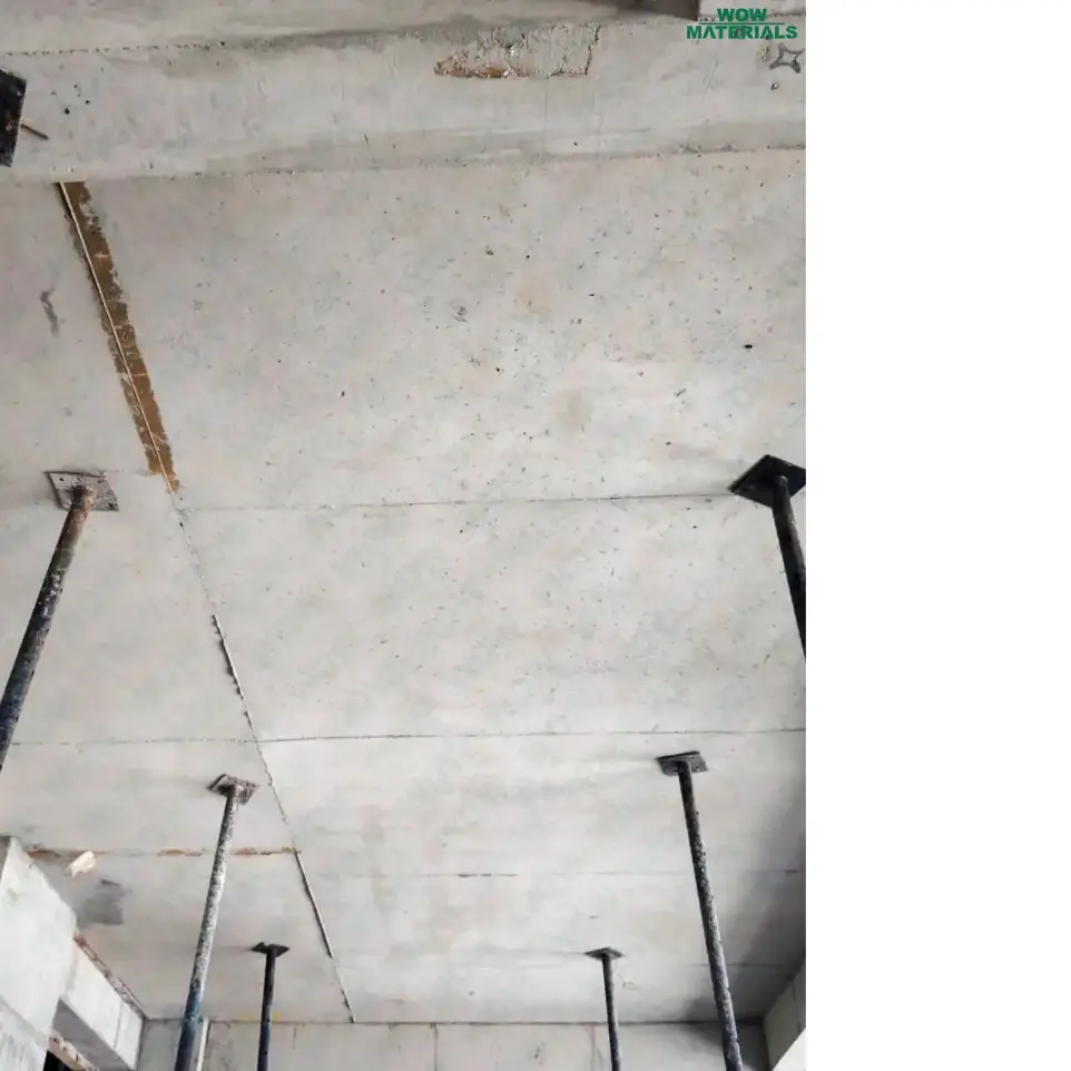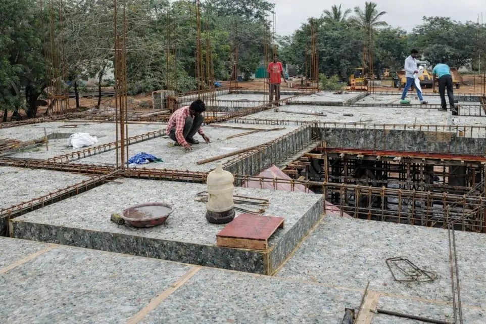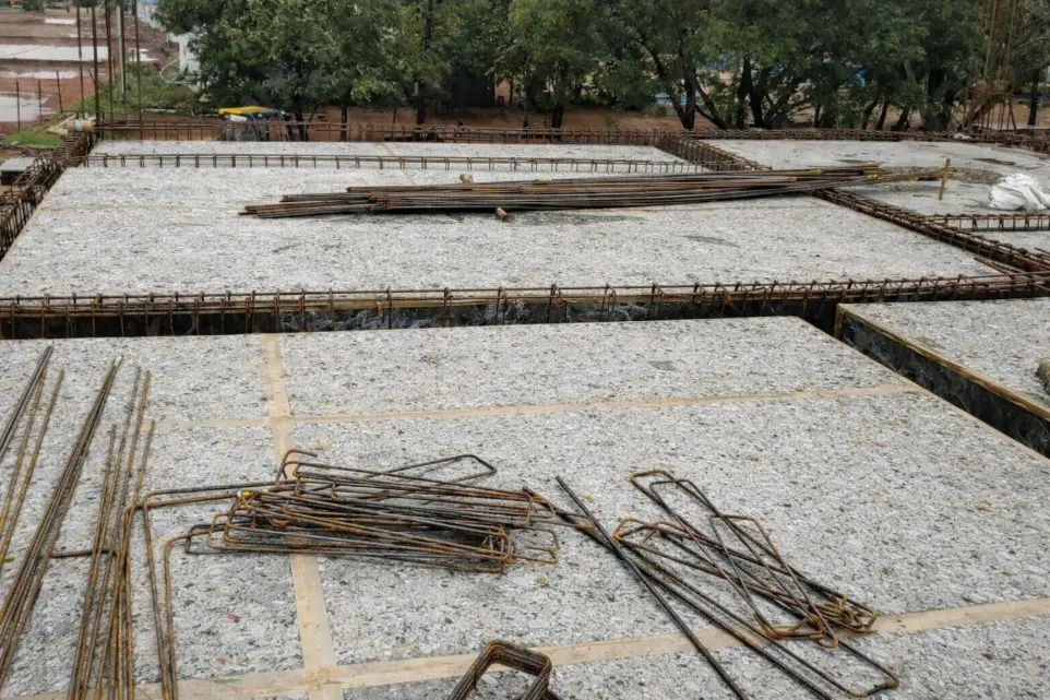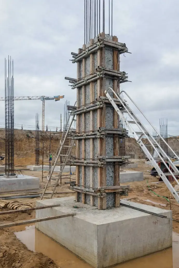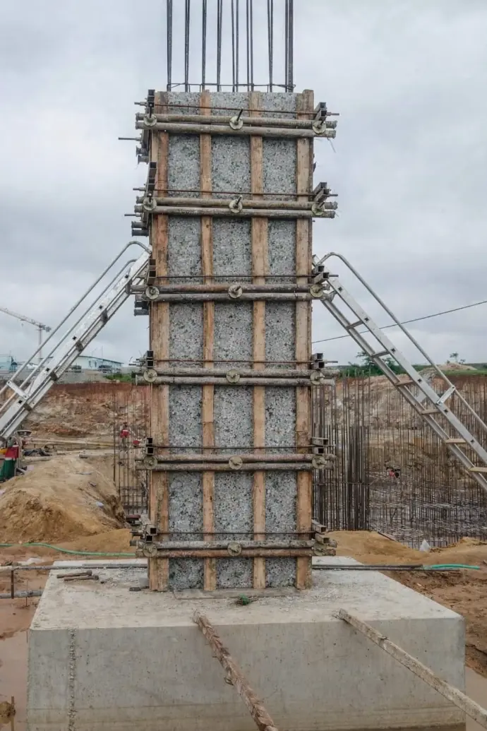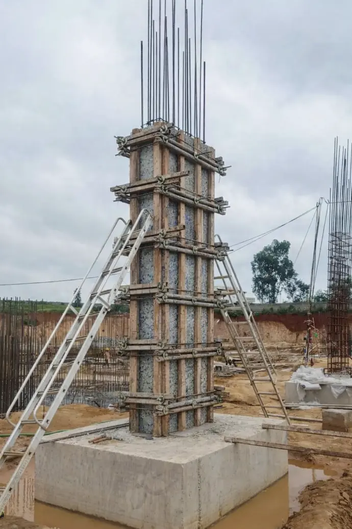 Recycled plastic sheets used in column shuttering at construction site